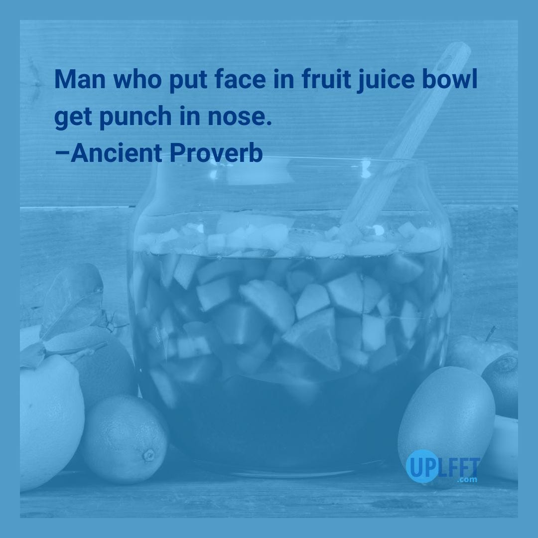 Man who put face in fruit juice bowl get punch in nose. –Ancient Proverb