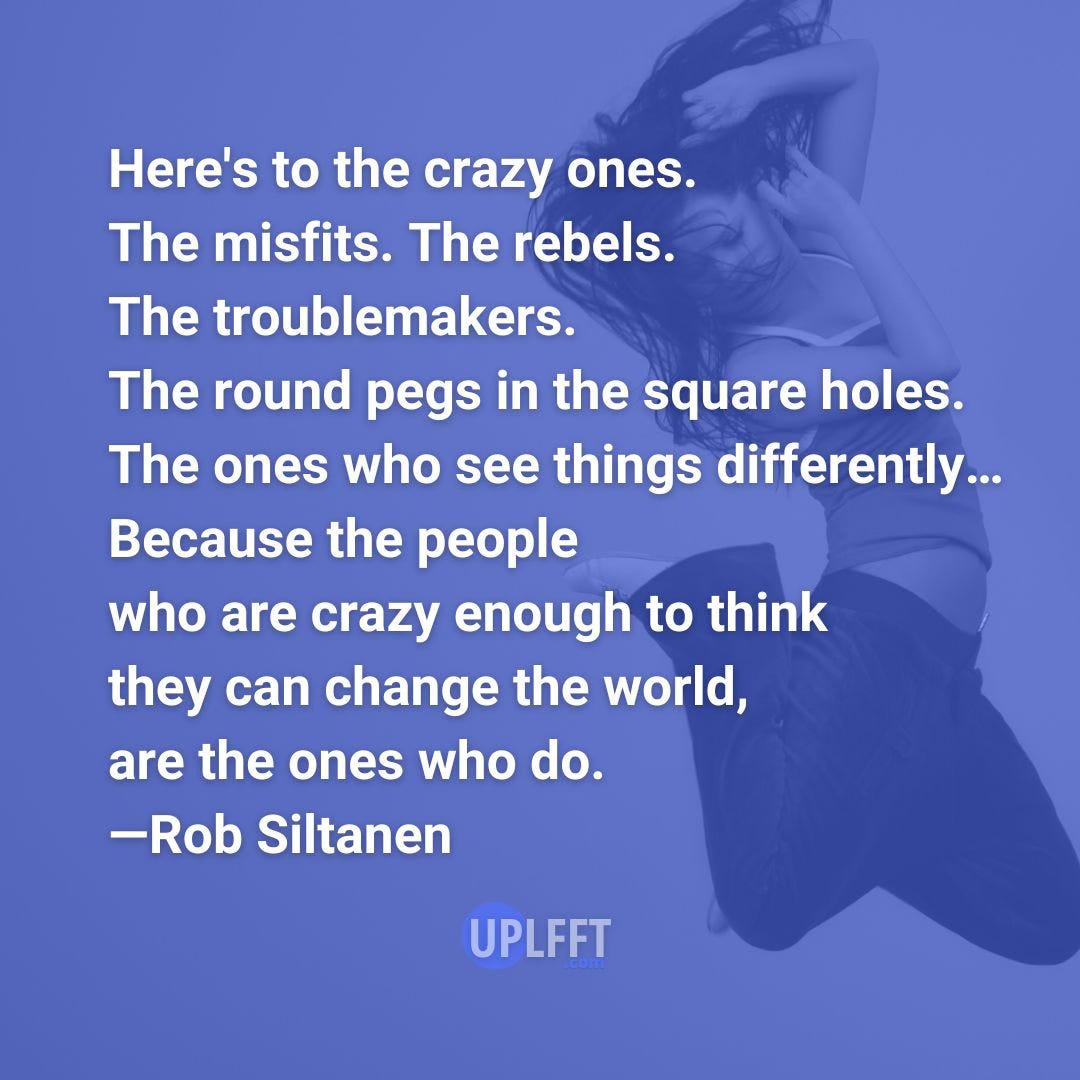Here's to the crazy ones. The misfits. The rebels. The troublemakers. The round pegs in the square holes. The ones who see things differently. … Because the people who are crazy enough to think they can change the world, are the ones who do. ―Rob Siltanen